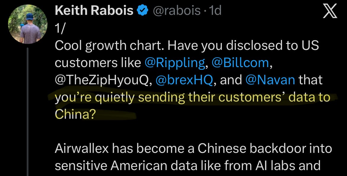 Keith Rabois, VC at Khosla Ventures, kicked off a firestorm on Twitter/X this week by publicly accusing a major global payments provider (Airwallex) of being an unintended data pipeline into China.