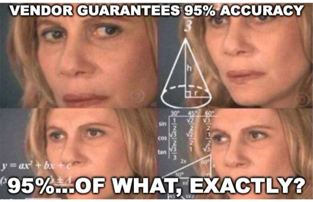 If you’re the vendor, this is where you get ahead of the problem: define the testing conditions, specify the dataset, and narrow the scope. Otherwise, you’ve just promised to be 90% accurate everywhere, forever…which is like promising your teenager will “always” clean their room. Good luck enforcing that.